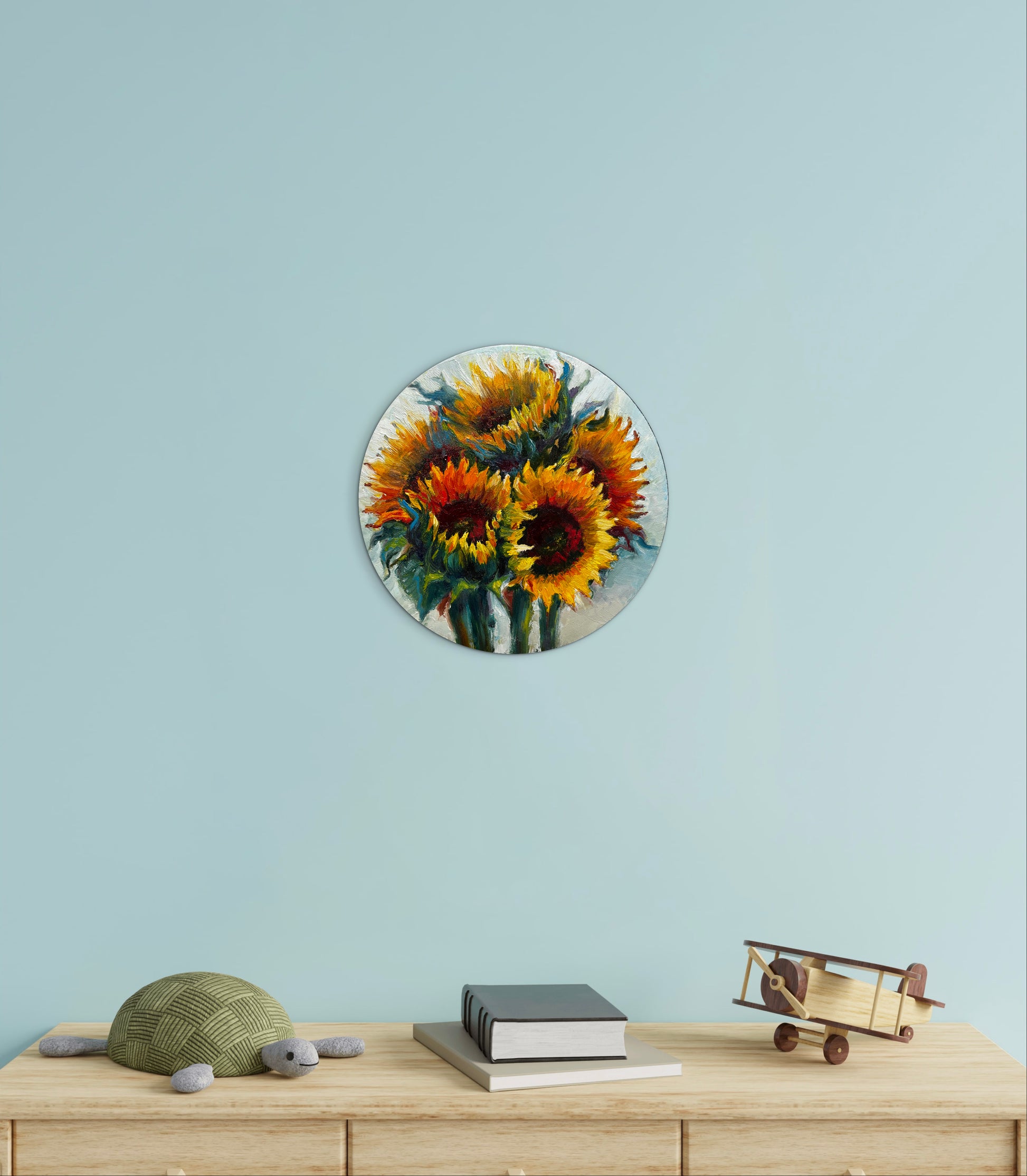 A Dance of Golden petals and Fiery Hearts, these sunflowers capture the warms of summer and the resilience of nature. Painted in vibrant strokes, they bring a timeless spirit of joy and strength to any home. A striking round canvas of radiant flowerheads, painted with rich texture and bold colours. Perfect as a statement piece, this artwork adds warmth, energy, and elegance to any space.
