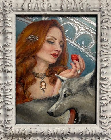 "Forbidden Fruit" is an original oil painting on panel, expertly framed to enhance its 18" x 24" (45.7 cm x 61 cm) presence. This refined piece embodies elegance and depth, perfect for discerning art collectors. Limited edition prints are available, strictly limited to 100 copies, ensuring exclusivity. Custom sizing options are also offered to fit your unique space—please call 416-434-9442 for inquiries.