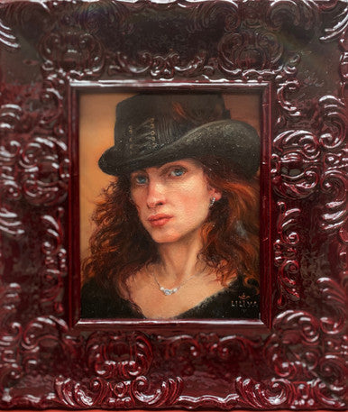 "Free Spirit" is a sophisticated oil on copper original, elegantly framed and sized at 8"x10" (20.3cm x 25.4cm). Original available.