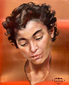 This oil painting on copper (8"x10") portrays a young woman seated in a Milan café, deeply engaged in reading while her large dog loyally guards her space. The artwork captures a moment of serene contemplation and quiet enlightenment, emphasizing presence beyond the distractions of modern life. Limited edition prints are available in a run of 100, with custom sizes offered upon request via email. This piece invites reflection on the peaceful connection between human and companion amid everyday surroundings.